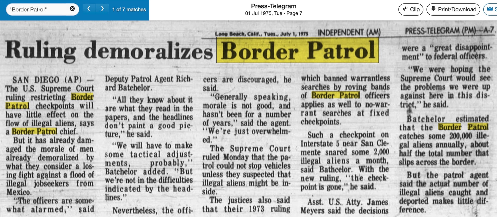 In July 1975, Border Patrol agents suffered low morale because the Supreme Court limited their authorities at checkpoints. The court stated agents could not stop vehicles unless they suspected they contained undocumented persons. The court also banned warrantless searches by Border Patrol agents as it violated the Constitution. Morale plummeted.