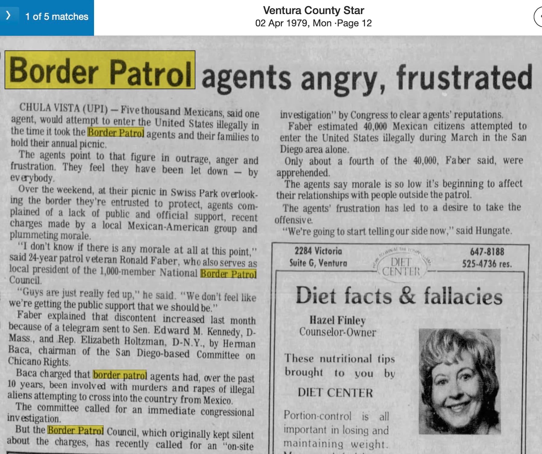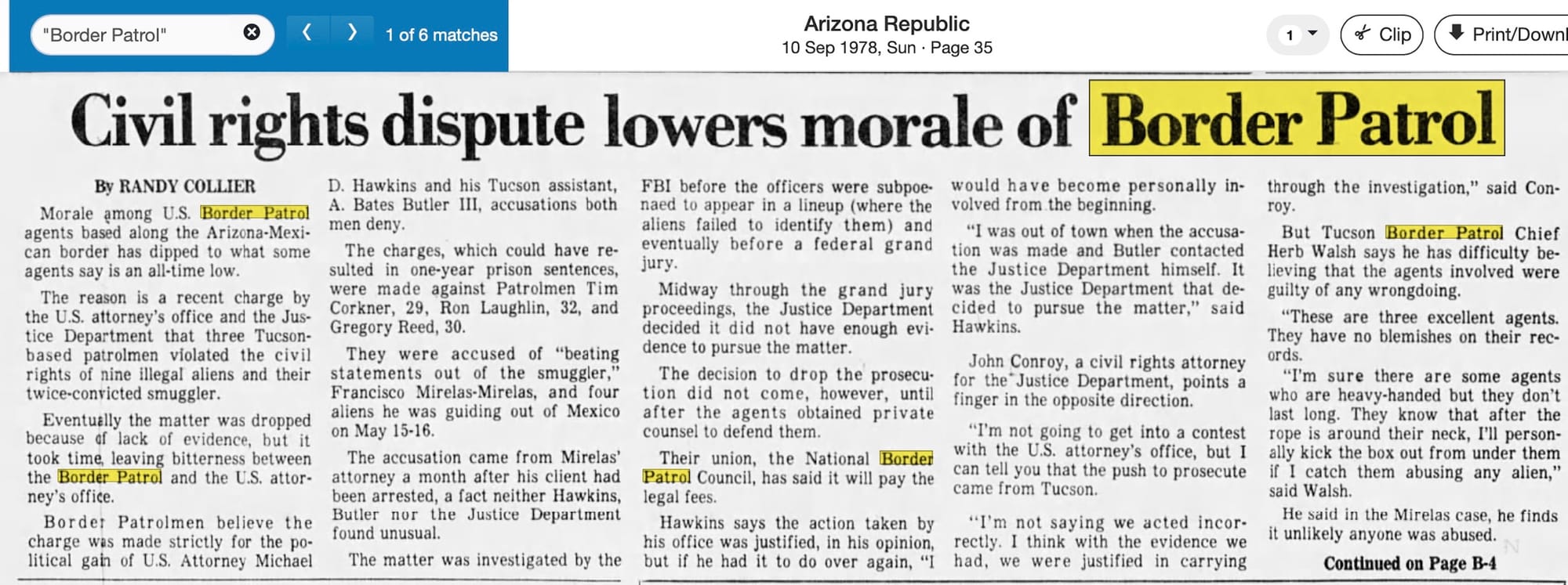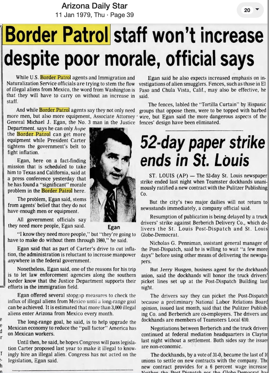 In 1979, immigration agents were suffering from low morale because they could not get more funding, resources, equipment and the federal government considered building them a wall. They also had low morale because they said no one liked them or their brutal tactics. The biggest drop in morale was blamed on people demanding accountability for the rapes and murders committed by agents.