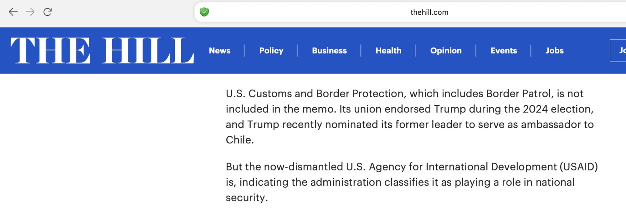 While Trump 2.0 has just released a new executive order banning the unions of the Bureau of Reclamation, NASA, the National Environmental Satellite, Data, and Information Service (NESDIS), the National Weather Service (NWS), Office of the Commissioner of Patents, Patent and Trademark Office (PTO) and the US Agency for Global Media (USAGM)has a grudge against, he continues to violate national security law by allowing the Border Patrol and CBP unions to exist. Under 5 USC 7112 (b)(6), no federal agency with national security designation can have a bargaining unit. Yet in 2020 under Trump 1.0, he designated both CBP and Border Patrol as national security agencies and they have been allowed to maintain that designation while keeping their unions for 5 years now.