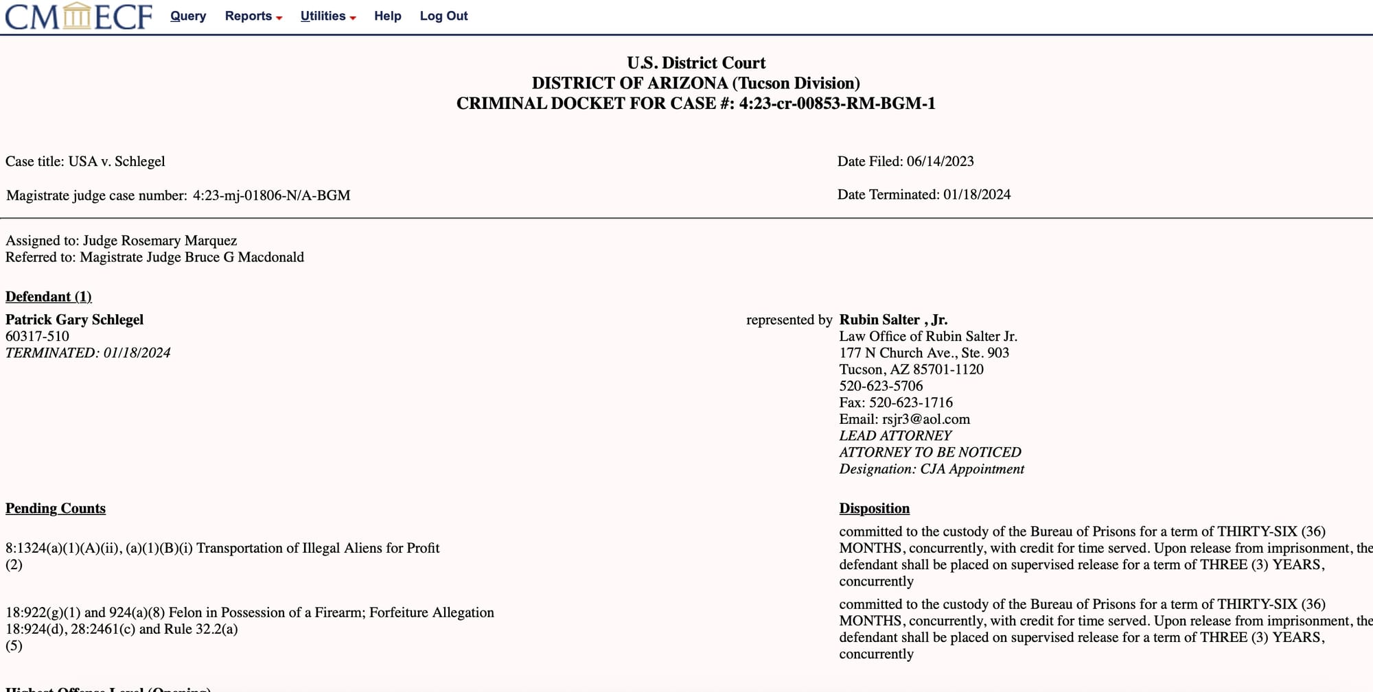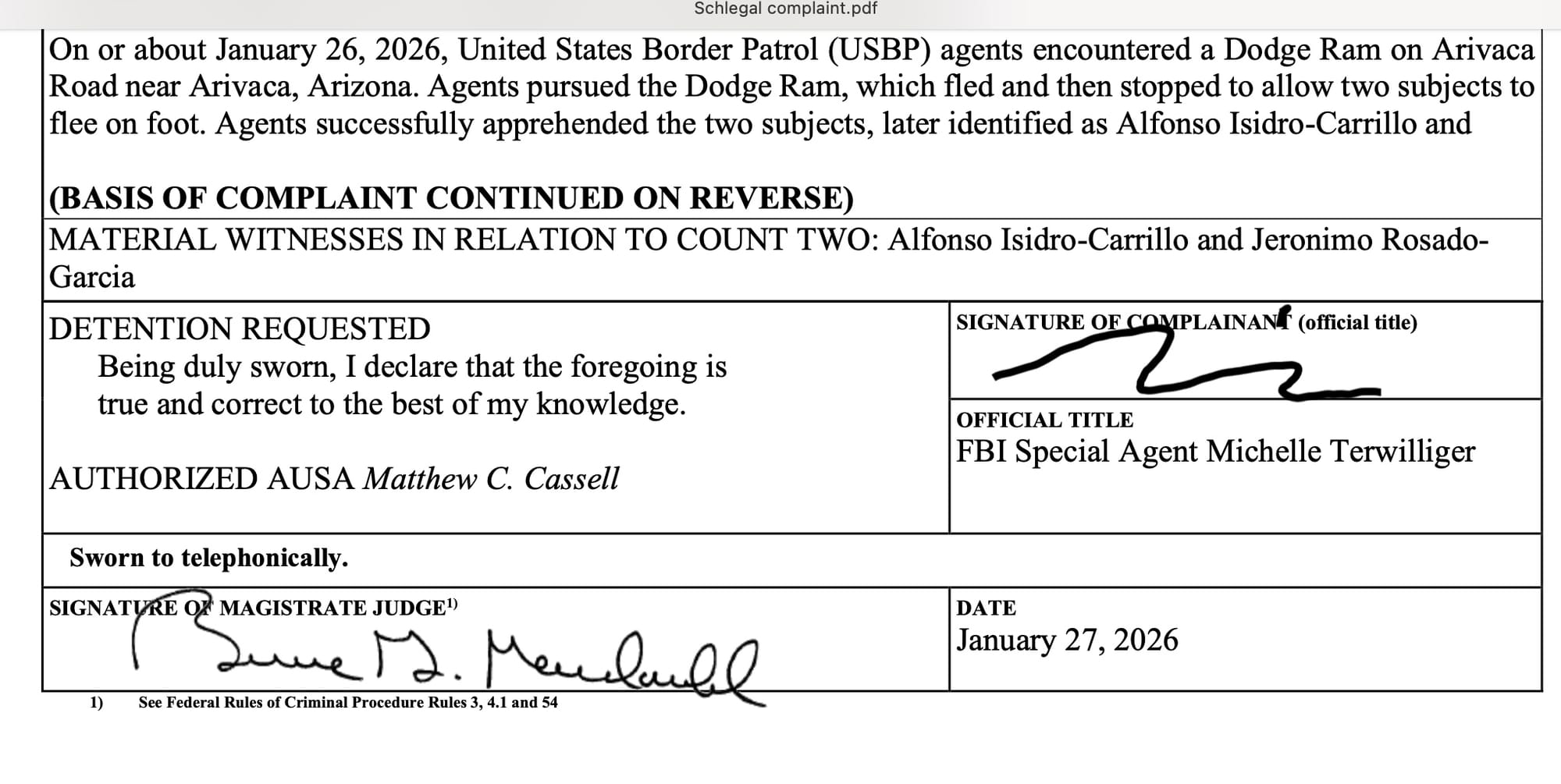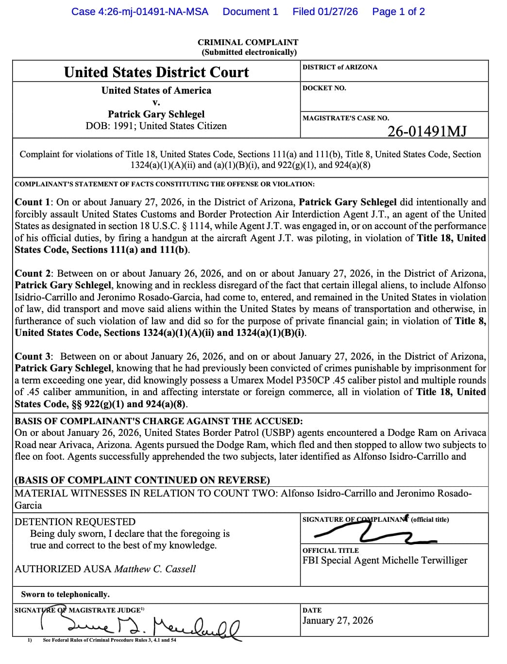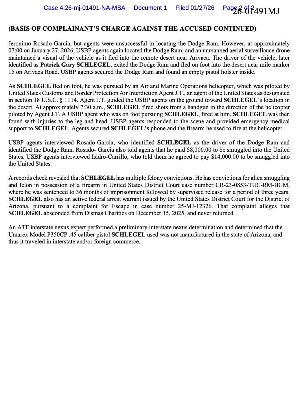 Schlegal criminal complaint for shooting at Border Patrol and smuggling.