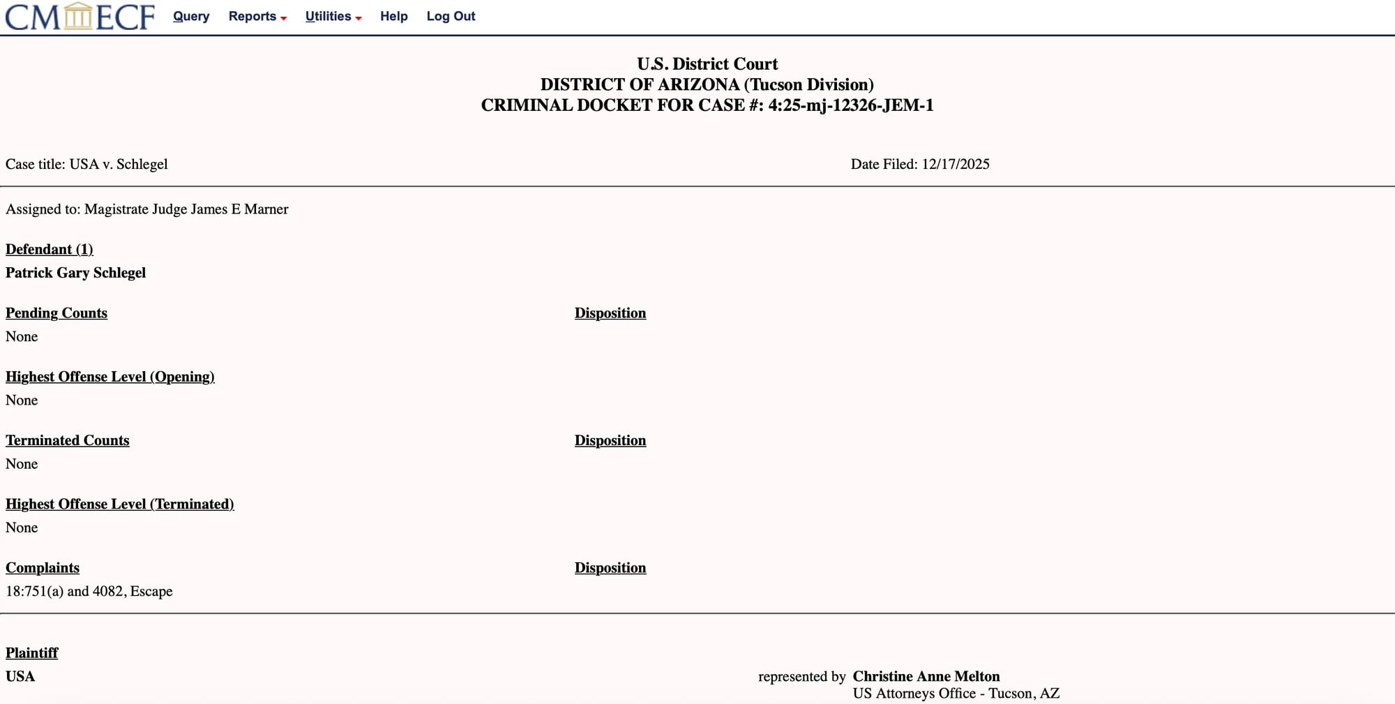 Here is the current criminal complaint and a warrant for escaping a halfway house in 2025: